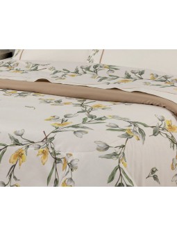 Es un diseño con un estampado elegante en tonos verdes, beige, arena y con un toque amarillo que aportará luz y viveza a al dormitorio.