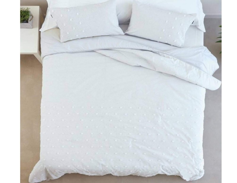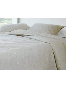Boutí edredón de 150 gramos/m2 de la firma Algodón Blanco. Diseño básico y a su vez original ya que en su parte inferior viene diseñado con pompones sobre el propio edredón y cojines como si fueran copos de nieve.