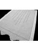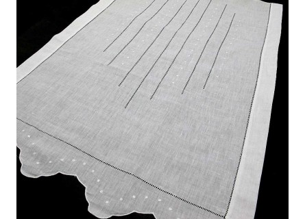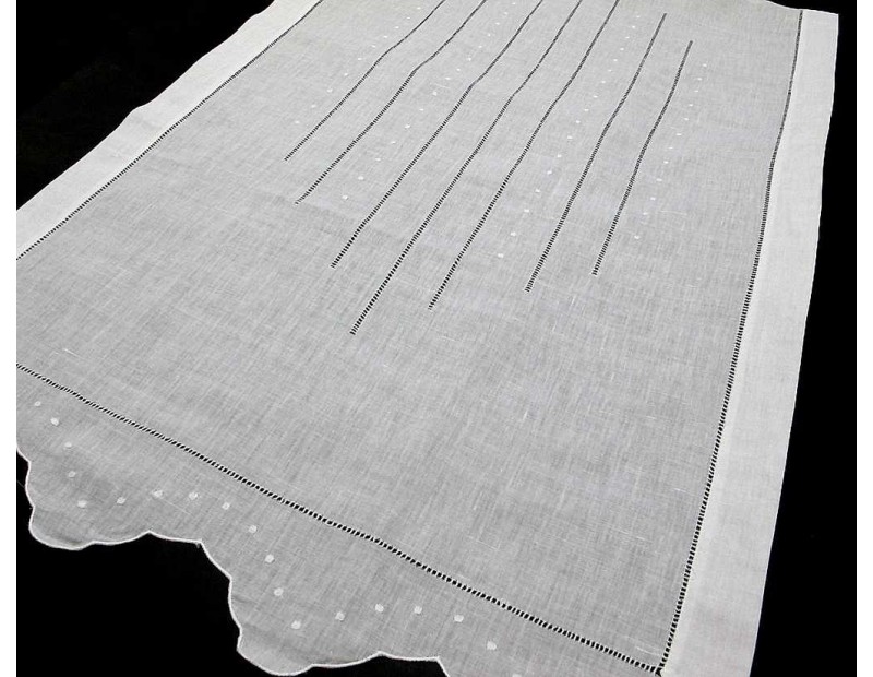 Cortina de hilo con vainicas sencilas y bodoques. Diseño terminado en onda. Cuenta con jareta en su parte superior para introducir barra o bien pegar con velcro al marco.