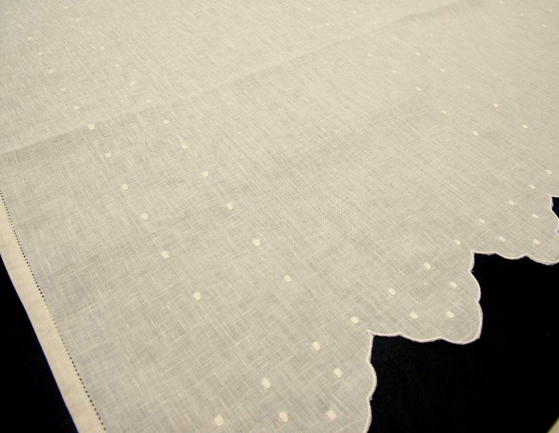 Cortina de hilo con bodoques bordados en tiras verticales. Diseño terminado en onda. Cuenta con jareta en su parte superior para introducir barra o bien pegar con velcro al marco.