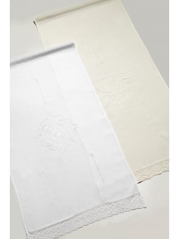 Cortina para hoja de ventana con dibujo central y terminado en puntilla. Cuenta con jareta en su parte superior para introducir barra o bien pegar con velcro al marco.