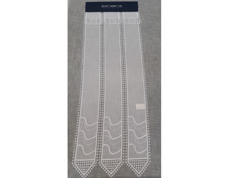 Cortina a medida para hoja de ventana con terminación en pico. Bordada en su parte inferior con detalle en onda.