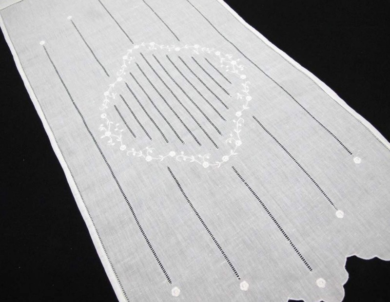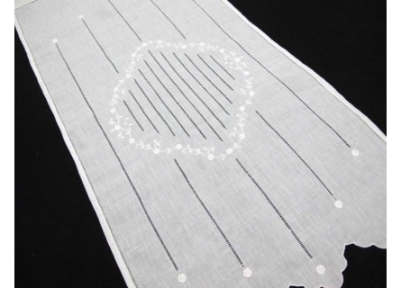 Cortina de hilo con con dibujo central bordado y vainicas. Diseño terminado en onda. Cuenta con jareta en su parte superior para introducir barra o bien pegar con velcro al marco.
