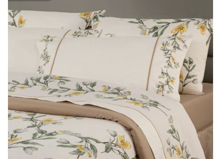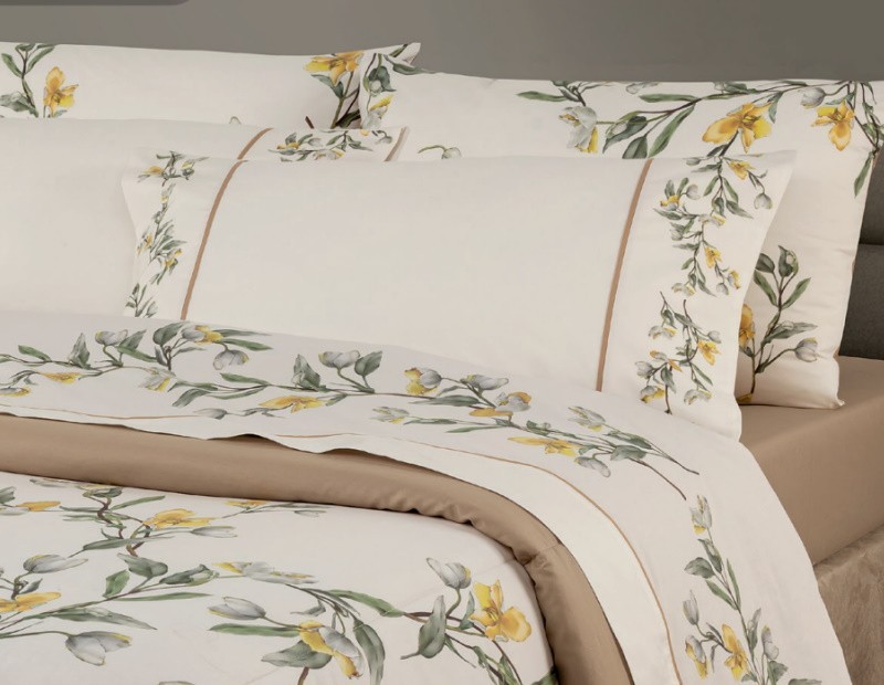 Es un diseño con un estampado elegante en tonos verdes, beige, arena y con un toque amarillo que aportará luz y viveza a al dormitorio.