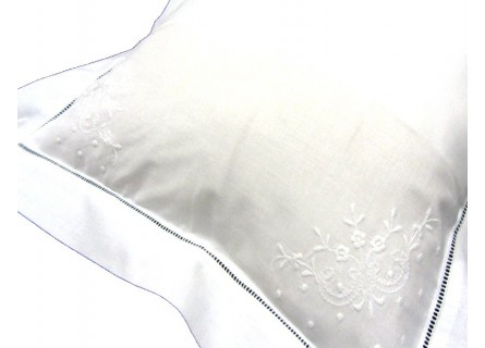 Funda de cojín de algodón bordada con detalle de flores en sus esquinas y vainicas. Su parte posterior es completamente lisa y tiene cierre central tipo sobre para una buena confortabilidad si se deseña utilizar para leer, dormir etc. Viene con pestaña decorativa de 5 cm. Aporta sencillez y calidez a tu dormitorio con esta prenda.