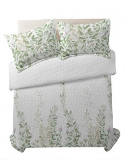 Colcha bouti Osúa con un diseño alegre en tonos verdes. Su fondo es blanco y el estampado se incluye en la parte inferior a pie de cama.