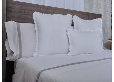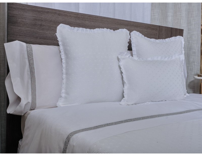 Funda de Cojín en 100% algodón de gran calidad en piqué con volantito plixado. Diseño elegante con topito bordado a juego con la Colcha Lencera Ragusa de Topitos o con la Colcha Edredón Lencera Ragusa de Topitos.