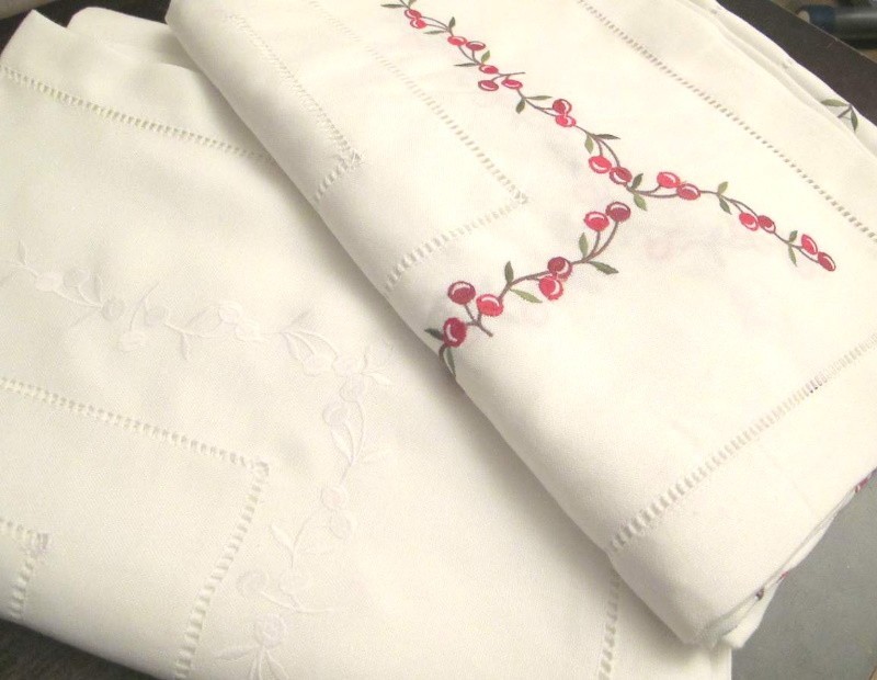 Mantelería diseñada con vainicas y detalle bordado de cerecitas.