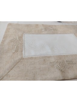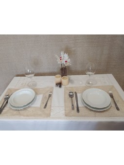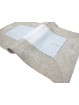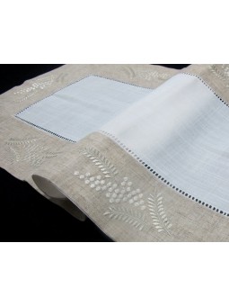 Tapete diseño con vainica y mimosas bordadas. Fondo blanco y cenefa en tono lino. Combina los tamaños para mesita y cómoda. Diseño central en blanco y cenefa en color lino con dibujo bordado al tono.